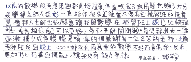 以前的數學段考應用題都直接放棄,但這次寫了應用題也賺了六分,我覺得老師人很好,一直給我很多正能量。不像其它補習班那樣責罵。禮拜六老師也很願意讓我問數學。在補習班上課也比較理解。我也相信自己可以更好!多和老師問問題。每次都進步一點,逐漸積少成多,慢慢累積,真的很感謝每一位辛苦的老師,之前老師陪我到晚上11:00,都沒有因為我的數學不好而責備我,反而更加用心指導到懂為止,讓我更有毅力堅持。