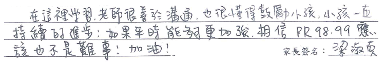 在這裡學習,老師很善於溝通,也很懂得鼓勵小孩,小孩一直持續的進步:如果平時能夠更加強.相信PR98.99應該也不是難事!加油!