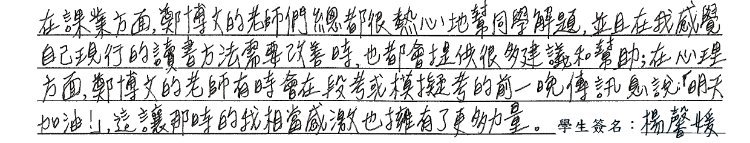 在課業方面,鄭博文的老師們總都很熱心地幫同學解題,並且在我感覺自己現行的讀書方法需要改善時,也都會提供很多建議和幫助;在心理方面,鄭博文的老師有時會在段考或模擬考的前一晚傳訊息說:「明天加油!」,這讓那時的我相當感激也擁有了更多力量。