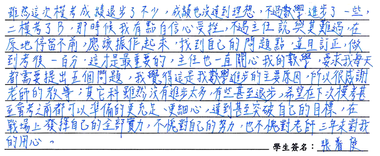 雖然這次模考成績退步了不少,成績也沒達到理想,不過數學進步了一些,二模考了B,那時候我有點自信心受挫,不過主任說與其難過,在原地停留不前,應該振作起來,找到自己的問題點,並且訂正,做到考後一百分,這才是最重要的。主任也一直關心我的數學,要求我每天都需要提出五個問題,我覺得這是我數學進步的主要原因,所以很感謝老師的教導;其它科雖然沒有進步太多,有些甚至退步,希望在下次模考甚至會考之前都可以準備的更充足、更細心,達到甚至突破自己的目標,在戰場上發揮自己的全部實力,不愧對自己的努力,也不愧對老師三年來對我的用心。