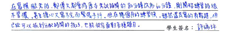 在寫模擬考時,鄭博文都會將原本考試時間的80分鐘改為60分鐘,剛開始練習時很不習慣,甚至擔心又寫不完而緊張手抖。但在幾個月的練習後,雖然還是寫的有點趕,但已經可以抓到分配時間的技巧,也能從容面對各種題目。