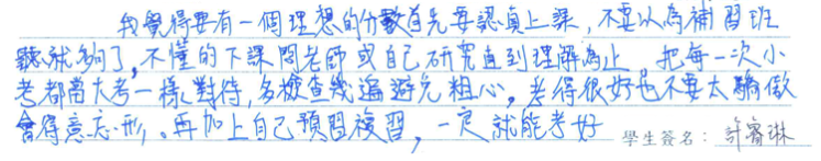 【學生心得分享】 我覺得要有一個理想的分數首先要認真上課,不要以為補習班聽就夠了,不懂的下課問老師或自己研究直到理解為止。把每一次小考都當大考一樣對待,多檢查幾遍避免粗心,考得很好也不要太驕傲會得意忘形。再加上自己預習複習,一定就能考好。 【家長真誠推薦】 養成自主學習的習慣,補習班是提供重點整理,要理解内容,而非死記。