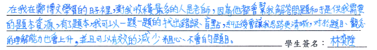 【學生心得分享】 在我在鄭博文學習的日子裡,對我收穫最多的人是老師,因為他都會幫我解答問題和提供我需要的題本資源,有了題本,我可以一題一題的找出錯誤、盲點,糾正後會讓我思路更清晰,對於題目、觀念的理解能力也會上升,並且可以有效的減少粗心,不會的題目。