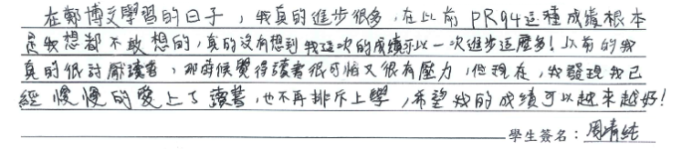 【學生心得分享】 在鄭博文學習的日子,我真的進步很多,在此前PR94這種成績根本是我想都不敢想的,真的沒有想到我這次的成績可以一次進步這麼多!以前的我真的很討厭讀書,那時候覺得讀書很可怕又很有壓力,但現在,我發現我已經慢慢的愛上了讀書,也不再排斥上學,希望我的成績可以越来越好!