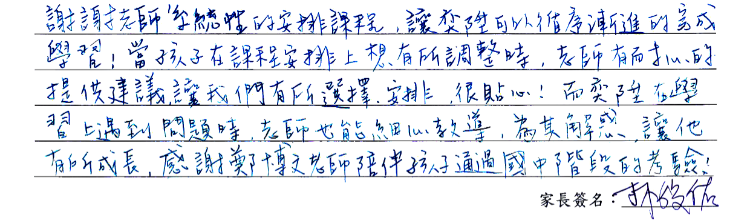 謝謝老師系統性的安排課程,讓奕陞可以循序漸進的完成學習!當孩子在課程安排上想有所調整時,老師有耐心的提供建議,讓我們有所選擇、安排,很貼心!而奕陞在學習上遇到問題時,老師也能細心指導,為其解惑,讓他有所成長,感謝鄭博文老師陪伴孩子通過國中階段的考驗!