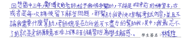 回想國中三年,鄭博文的老師給予我很多幫助,不論是段考前的練習本,亦或者是每次課後留下解答問題,都幫助我更快理解考試內容,並且不論我需要什麼幫助,老師總是在力所能及下盡力的幫助我,其中,我最忘不了的就是老師願意在非上課日到補習班為學生解惑。