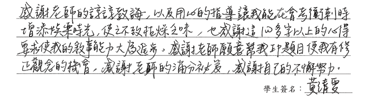 【前三志願學生心得分享】-北一女中黃靖雯 感謝老師的諄諄教誨,以及用心的指導,讓我能在會考衝刺時增添娛樂時光,使之不致枯燥乏味,也感謝這100多字以上的心得要求使我的敘事能力大為進步。感謝老師願意幫我印題目,使我有修正觀念的機會,感謝老師的滿分祕笈,感謝自己的不懈努力。 【家長真誠推薦】 感謝老師的細心教導。