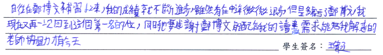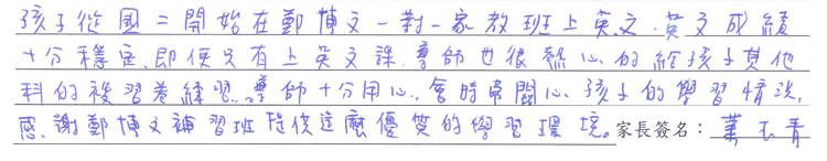 【學生心得分享】 自從在鄭博文補習以來,我的成績就不斷進步,雖然有在中途微微退步,但是多虧了鄭博文,我現在又再一次回到這個第一名的位,同時也要感謝鄭博文能配合我的讀書需求,能為我解惑的老師協助才有今天。 【家長真誠推薦】 孩子從國二開始在鄭博文一對一家教班上英文,英文成績十分穩定,即使只有上英文課,導師也很熱心的給孩子其他科的複習卷練習。導師十分用心,會時常關心孩子的學習情況,感謝鄭博文補習班提供這麼優質的學習環境。