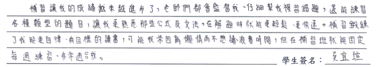 【學生心得分享】 補習讓我的成績越來越進步了,老師們都會監督我、仔細幫我複習錯題,還能練習各種類型的題目,讓我更熟悉那些公式及文法,在解題時就能更輕鬆、更快速。補習鍛鍊了我能更自律,有目標的讀書,可能我常因為懶情而不想讀浪費時間,但在補習班就能固定每週練習,非常適合我。
