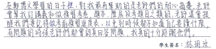 【學生心得分享】 在鄭博文學習的日子裡,對我最有幫助的是老師們的耐心指導,老師會幫我訂講義和做複習考卷、題本、歷屆段考題目之類的,老師還會提醒我們要記得做考前複習進度表,以免到時候都不知道自己要讀什麼,有問題的時候老師們都會認真回答問題,我真的十分感謝他們。