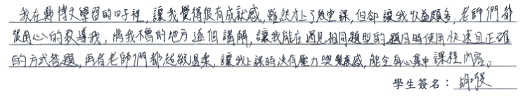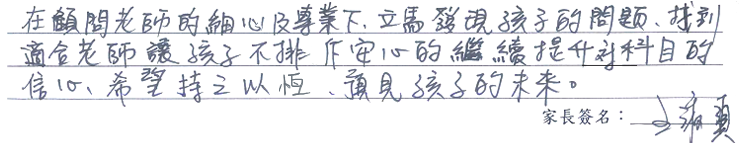 【學生心得分享】 我在鄭博文學習的日子裡,讓我覺得很有成就感,雖然才上了幾堂課,但卻讓我收益頗多,老師們都很用心的教導我,將我不會的地方逐個講解,讓我能在遇見相同題型的題目時使用快速且正確的方式答題,再者老師們都超級溫柔,讓我上課時沒有壓力與緊張感,能全身心集中課程內容。 【家長真誠推薦】 在顧問老師的細心及專業下,立馬發現孩子的問題,找到適合老師讓孩子不排斥安心的繼續提升對科目的信心,希望持之以恆,預見孩子的未來。