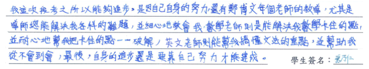 【學生心得分享】 我這次段考之所以能夠進步,是因自己自身的努力,還有鄭博文每個老師的教導,尤其是導師總能解決我各科的難題,並細心地教會我,數學老師則是能解決我數學卡住的點,並耐心地幫我把卡住的點一一破解,英文老師則能幫我搞懂文法的重點,並幫助我從不會到會,最後,自身的進步還是要靠自己努力才能達成。