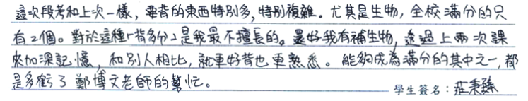 【學生心得分享】 這次段考和上次一樣,要背的東西特別多,特別複雜。尤其是生物,全校滿分的只有2個。對於這種「背多分」是我最不擅長的。還好我有補生物,透過上兩次課來加深記憶,和別人相比,就更好背也更熟悉。能夠成為滿分的其中之一,都是多虧了鄭博文老師的幫忙。