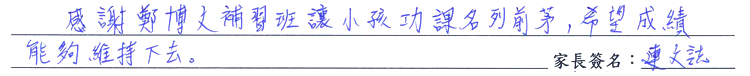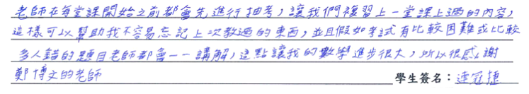【學生心得分享】 老師在每堂課開始之前都會先進行抽考,讓我們複習上一堂課上過的內容,這樣可以幫助我不容易忘記上次教過的東西,並且假如考試有比較困難或比較多人錯的題目,老師都會一一講解,這點讓我的數學進步很大,所以很感謝鄭博文的老師。 【家長真誠推薦】 感謝鄭博文補習班讓小孩功課名列前茅,希望成績能夠維持下去。