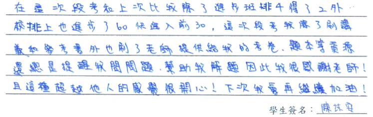 【學生心得分享】 在這次段考和上次比我除了進步班排4得了2外,校排上也進步了60快進入前30,這次段考我除了刷講義和參考書外,也刷了老師提供給我的考卷、題本等資源,還總是提醒我問問題,幫助我解題,因此我很感謝老師!且這種超越他人的感覺很開心!下次我會再繼續加油!