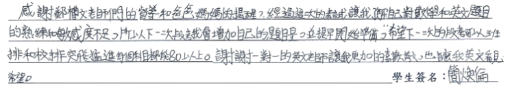 【學生心得分享】 感謝鄭博文老師們的督導和爸爸媽媽的提醒,經過這次的考試,讓我了解自己對數學和英文題目的熟練和敏感度不足,所以下一次段考我會增加自己的題目量,並提早開始準備,希望下一次的段考可以班排和校排突飛猛進,每個科目都能80以上。謝謝一對一的英文老師讓我更加的喜歡英文,也讓我英文看見希望。