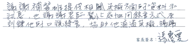【學生心得分享】 謝謝老師加強了我在文法及聽力方面的能力,使我能在這次複試掌握文意,並且清楚地回答每一題。謝謝老師出錄音作業,用錄音的方式訓練我的口說能力,在正式考試回答問題時不會有發音不標準及語速過快或遲鈍等基本的問題,我才能通過這次複試。真的非常感謝 【家長真誠推薦】 謝謝補習班提供相關英檢方面的資料和訊息,也謝謝老師幫忙庭旭用錄音方式來訓練他的口說發音,協助他通過英檢,謝謝