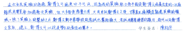 這次全民英檢的通過,鄭博文可說是功不可没,因為我的英檢能力幾乎都是鄭博文培養出來的。以前雖然有零星參加過幾次英檢,但大多都是憑實力考,只有來到鄭博文之後,才算真正接觸並熟悉英檢的領域。除了英檢上的幫助之外,鄭博文對平常學校的考試也幫助極大,考試有需要練習的題目,都可以向鄭博文索取,總之,鄭博文可以說是學生的最佳好幫手。