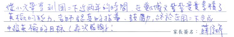 從小六畢業到國二下近兩年的時間,在鄭博文紮紮實實累積了英檢的能力,老師認真的指導、鼓勵,終於在國二下完成中級英檢的目標!再次感謝!