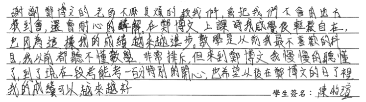 【學生心得分享】 謝謝鄭博文的老師不厭其煩的教我們,會把我們不會的地方教到會,還會耐心的講解,在鄭博文上課時我感覺很輕鬆自在,也因為這樣我的成績越來越進步。數學是以前我最不喜歡的科目,我以前都聽不懂數學,非常排斥,但來到鄭博文我慢慢的聽懂了,到了現在段考能考一百分特別的開心,也希望以後在鄭博文的日子裡我的成績可以越來越好