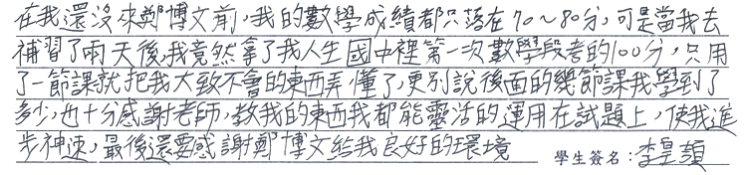 【學生心得分享】 在我還沒來鄭博文前,我的數學成績都只落在70〜80分,可是當我去補習了兩天後,我竟然拿了我人生國中第一次數學段考的100分,只用了一節課就把我大致不會的東西弄懂了,更別說後面的幾節課我學到了多少,也十分感謝老師,教我的東西我都能靈活的運用在試題上,使我進步神速,最後還要感謝鄭博文給我良好的環境