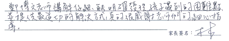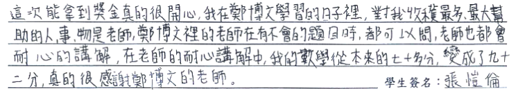 【學生心得分享】 這次能拿到獎金真的很開心,我在鄭博文學習的日子裡,對我收穫最多、最大幫助的人、事、物是老師,鄭博文裡的老師在有不會的題目時,都可以問,老師也都會耐心的講解,在老師的耐心講解中,我的數學從本來的七十多分,變成了九十二分,真的很感謝鄭博文的老師。 【家長真誠推薦】 鄭博文老師講解仔細,能明確發現孩子遇到的困難點,並提供最適切的解決方式,真的很感謝老師們的細心指導。