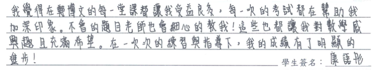 【學生心得分享】 我覺得在鄭博文的每一堂課都讓我受益良多,每一次的考試都在幫助我加深印象。不會的題目老師也會細心的教我!這些也都讓我對數學感興趣且充滿希望。在一次次的練習與指導下,我的成績有了明顯的進步!