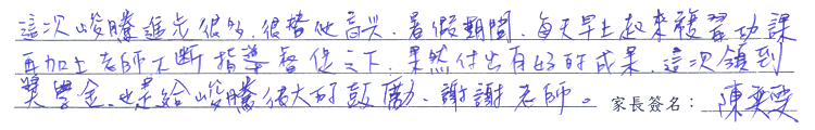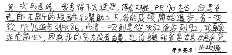 【學生心得分享】 第一次段考時,我考得不太理想,僅有大概PR70左右,但是在老師不斷的提醒和幫助之下,我的成績開始進步,有一次從PR76進步到PR86,而這一次則是從PR82進步到92,我真的非常開心,因為我的努力沒有白費,也沒讓我爸爸媽媽失望。 【家長真誠推薦】 這次峻騰進步很多,很替他高興,暑假期間,每天早上起來複習功課,再加上老師不斷指導督促之下,果然付出有好的成果。這次領到獎學金也是給峻騰很大的鼓勵,謝謝老師。