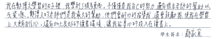 【學生心得分享】 我在鄭博文學習的日子裡,我學到了很多東西,不僅僅是我自己的努力,還有很多老師的幫助以及資源,鄭博文的老師們是我最大的幫助,他們會耐心的指導我,還會鼓勵我,使我在學習上又更有自信心。還有加上良好的讀書環境,讓我能專心的投入在讀書上。