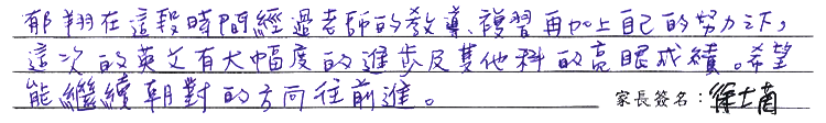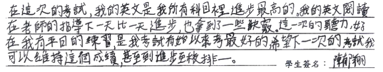 【學生心得分享】 在這次的考試,我的英文是我所有科目裡進步最高的,我的英文閱讀在老師的指導下一天比一天進步,也拿到了一些訣竅。這一次的聽力,好在我有平日的練習,是我考試有始以來考最好的,希望下一次的考試我可以維持這個成績,甚至到進步至校排一。 【家長真誠推薦】 郁翔在這段時間經過老師的教導、複習再加上自己的努力之下,這次的英文有大幅度的進步及其他科的亮眼成績。希望能繼續朝對的方向往前進。
