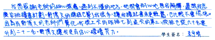 【學生心得分享】 我想感謝老師的細心教導,遇到不懂的地方,她都會耐心地替我解釋,還教我怎麼安排讀書計劃。鄭博文的課程也幫了我很多,讓我讀起書來更輕鬆,也比較不會慌張。因為有鄭博文的老師們幫忙,我從上次的班排七到這次的第三,校排也從六十名提升到二十一名。鄭博文讓我更有信心繼續努力。