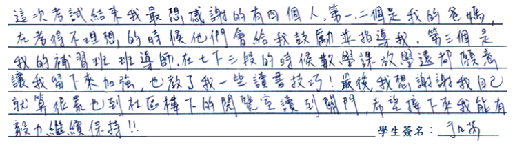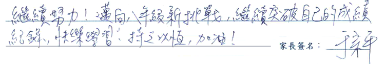 【學生心得分享】 這次考試結束我最想感謝的有四個人,第一二個是我的爸媽,在考得不理想的時候他們會給我鼓勵並指導我,第三個是我的補習班班導師,在七下三段的時候,數學課放學還都願意讓我留下來加強,也教了我一些讀書技巧!最後我想謝謝我自己,就算很累,也到社區樓下的閱覽室讀到關門,希望接下來我能有毅力繼續保持! 【家長真誠推薦】 繼續努力!邁向八年級新挑戰,繼續突破自己的成績紀錄,快樂學習!持之以恆,加油!