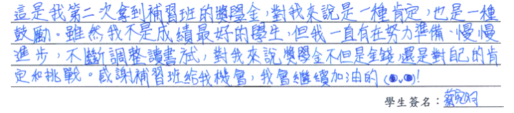 【學生心得分享】 這是我第二次拿到補習班的獎學金,對我來說是一種肯定,也是一種鼓勵。雖然我不是成績最好的學生,但我一直有在努力準備、慢慢進步,不斷調整讀書方式,對我來說獎學金不但是金錢,還是對自己的肯定和挑戰。感謝補習班給我機會,我會繼續加油的。