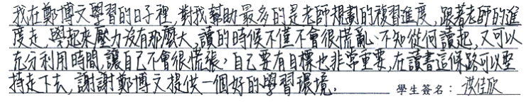 【學生心得分享】 我在鄭博文學習的日子裡,對我幫助最多的是老師規劃的複習進度,跟著老師的進度走,學起來壓力沒有那麼大,讀的時候不僅不會很慌亂、不知從何讀起,又可以充分利用時間,讓自己不會很慌張,自己要有目標也非常重要,在讀書這條路可以堅持走下去,謝謝鄭博文提供一個好的學習環境。