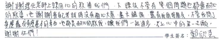 【學生心得分享】 謝謝理化老師上課用心的教導我們,下課後不管有幾個問題也都會耐心的教導,也謝謝我自己考試時沒有粗心大意、畫卡錯誤,還有我的好朋友,不管我問了多麼蠢或多麼基本的東西,也都是耐心的教我,讓我們一起進步,考上心中的第一志願,謝謝你們!