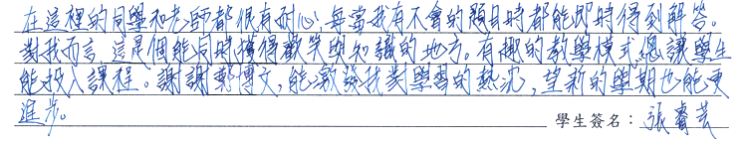 【學生心得分享】 在這裡的同學和老師都很有耐心,每當我有不會的題目時,都能即時得到解答。對我而言,這是個能同時獲得歡笑與知識的地方。有趣的教學模式總讓學生能投入課程。謝謝鄭博文,能激發我對學習的熱忱,望新的學期也能更進步。