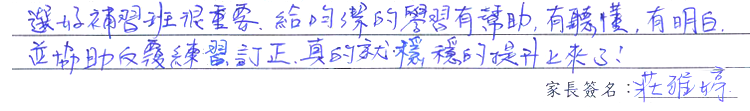 【學生心得分享】 這次的數學成績非常的滿意,是有史以來第一次終於沒粗心錯的一次,之前只有90以上,但沒達到100分,英文也是進步了很多,進步了10幾分,非常感謝鄭博文的老師把我的數學熟練到完美,英文也有很大的進步!國文似乎有比較難,但我依然還是有進步,謝謝鄭博文給的題本練習,讓我成績越來越好! 【家長真誠推薦】 選好補習班很重要,給昀潔的學習有幫助,有聽懂,有明白,並協助反覆練習、訂正,真的就穩穩的提升上來了!