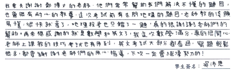 【學生心得分享】 我要先謝謝鄭博文的老師,他們常常幫助我們解決不懂的題目,也會很有耐心的教導,這次考試前有去問地理的題目,老師教的淺顯易懂,很快就會了,地理段考也只錯了一題,真的很謝謝老師們的幫助。再來想感謝的就是數學和英文了,我這次數學滿分,真的很開心,老師上課教的技巧考試也有用到,英文考試大部分都看過,寫題輕鬆很多,都要謝謝老師們的用心指導,下次一定會繼續努力的!