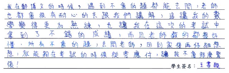 【學生心得分享】 我在鄭博文的時候,遇到不會的題都能去問,老師也都會很有耐心的去跟我們講解,這讓我的數學變得更加熟練,也讓我在這次的考試中拿到了不錯的成績,而且老師教的都很好懂,所有不會的題,去問老師,回到家後再仔細想想,就能夠在考試的時候從容應付,讓我不會那麼緊張!