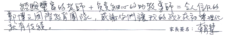經驗豐富的老師+負責細心的助教導師=令人信任的鄭博文國際教育團隊,感謝你們讓我的孩子在初學理化就有佳績。