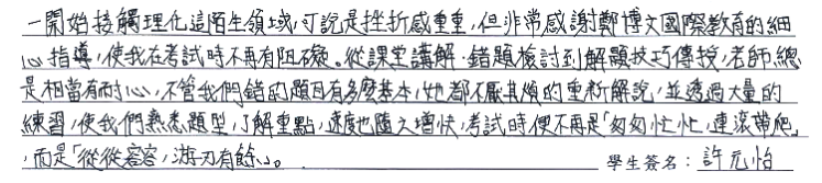 一開始接觸理化這陌生領域,可說是挫折感重重,但非常感謝鄭博文國際教育的細心指導,使我在考試時不再有阻礙。從課堂講解,錯題檢討到解題技巧傳授,老師總是相當有耐心,不管我們錯的題目有多麼基本,她都不厭其煩的重新解說,並透過大量的練習,使我們熟悉題型,了解重點,速度也隨之增快,考試時便不再是「匆匆忙忙,連滾帶爬」,而「從從容容,游刃有餘」。