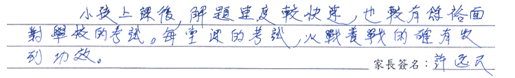 【學生心得分享】 鄭博文國際教育教會我許多,尤其在數學方面。一開始我還不習慣這裡的教學方式,非常嚴格,後來逐漸適應,每個同學都很厲害,競爭激烈,平常寫很多考古題還有考卷,讓我在段考時速度提升,我也從一個很害怕數學並且考試都算不完的人變成一個對數學有自信,解題速度快的人。 【家長真誠推薦】 小孩上課後,解題速度較快速,也較有餘裕面對學校的考試。每堂課的考試,以戰養戰的確有收到功效。