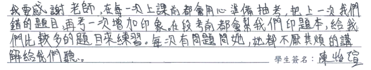 我要感謝老師,在每一次上課前都會用心準備抽考,把上一次我們錯的題目,再考一次增加印象。在段考前都會幫我們印題本,給我們比較多的題目來練習。每次有問題問她,她都不厭其煩的講解給我們聽。