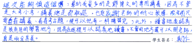 【學生心得分享】 這次能夠領這個獎,幫助我最多的是鄭博文的專用講義,因為不管是大考小考,講義總是都教過,也要感謝老師的耐心教導,段考前只要看看講義、看看考古題,便可以把每一科複習完,此外,讀書班我認為是很有用的學習地方,因為在這裡可以認真地讀書,不會的地方還可以問老師,真是兩全其美。