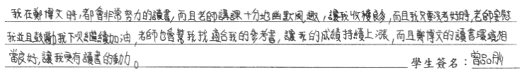 【學生心得分享】 我在鄭博文時,都會非常努力的讀書,而且老師講課十分地幽默風趣,讓我收穫良多,而且我只要沒考好時,老師安慰我並且鼓勵我下次繼續加油,老師也會幫我找適合我的參考書,讓我的成績持續上漲,而且鄭博文的讀書環境相當良好,讓我更有讀書的動力。