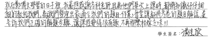 【學生心得分享】 我在鄭博文學習的日子裡,我最想感謝各科老師,因為他們每次上課時,都將知識仔仔細細的交給我們,為我們整理出最適合我們的題目、作業,每堂課都將考卷的題目解說,並告訴我們正確的解題步驟,讓課程變得很有趣,不再那麼枯燥乏味!!!