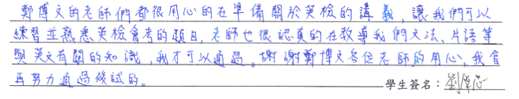 【學生心得分享】 鄭博文的老師們都很用心的在準備關於英檢的講義,讓我們可以練習並熟悉英檢會考的題目,老師也很認真的在教導我們文法、片語等與英文有關的知識,我才可以通過。謝謝鄭博文各位老師的用心,我會再努力通過複試的。