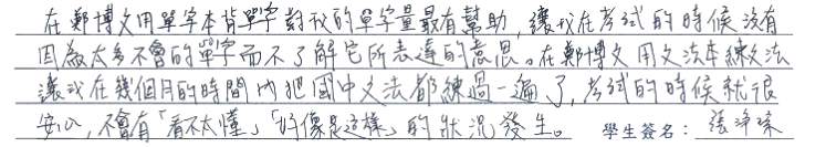 【學生心得分享】 在鄭博文用單字本背單字對我的單字量最有幫助,讓我在考試的時候沒有因為太多不會的單字而不了解它所表達的意思。在鄭博文用文法本來練文法,讓我在幾個月的時間內把國中文法都練過一遍了,考試的時候就很安心,不會有「看不太懂」「好像是這樣」的狀況發生。