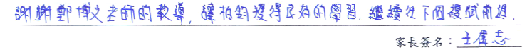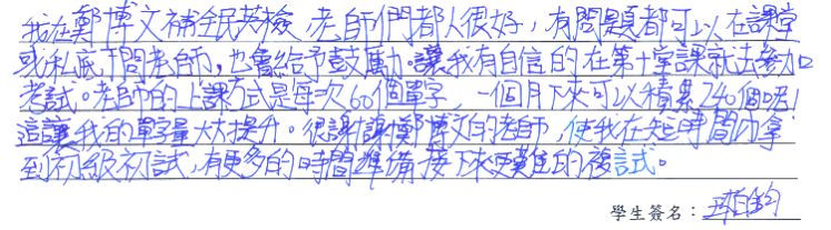 【學生心得分享】 我在鄭博文補全民英檢,老師們都人很好,有問題都可以在課堂或私底下問老師,也會給予鼓勵。讓我有自信的在第十堂課就去參加考試。老師的上課方式是每次60個單字,一個月下來可以積累240個呢!這讓我的單字量大大提升。很謝謝鄭博文的老師,使我在短時間內拿到初級初試,有更多的時間準備接下來更難的複試。 【家長真誠推薦】 謝謝鄭博文老師的教導,讓柏鈞獲得良好的學習,繼續往下個複試前進。