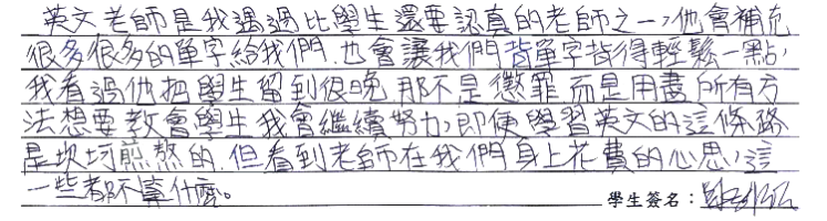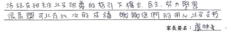 【學生心得分享】 英文老師是我遇過比學生還要認真的老師之一,他會補充很多很多的單字給我們,也會讓我們背單字背得輕鬆一點,我看過他把學生留到很晚,那不是懲罪而是用盡所有方法想要教會學生,我會繼續努力,即便學習英文的這條路是坎坷煎熬的,但看到老師在我們身上花費的心思,這一些都不算什麼。 【家長真誠推薦】 沛紜在班主任以及班導的指引下獨立、自主、努力學習,很高興可以有此次的成績,謝謝您們的用心及支持。